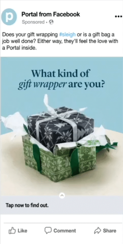 We created a stop-motion Instant Experience that let users figure out which Portal was right for them, based on their gift wrapping styles. Whether their gift wrapping could land them a job at Saks 5th Avenue or they would be asked to never wrap presents again, this was one of Meta’s most engaging Instant Experiences to date. Thumbs stopped and interacted.